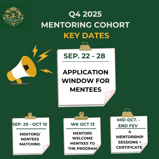 This is a zero cost program, where we will select latin women that apply for mentorship during a period of 3-4 months up to the capacity of the volunteer mentors, and based on fit with application. You will be given the details of your mentor, with whom you can book 3 appointments of max an hour each, and agree on the specific method (zoom, teams, facetime, etc).